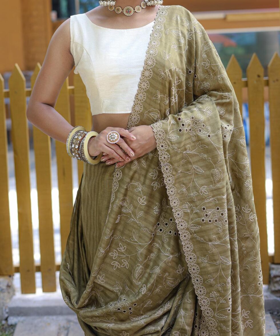 Drape yourself in luxury with this Pure Soft Silk Saree, exquisitely adorned with beautiful thread handwork. It showcases an elegant floral design complemented by a sophisticated cutwork border, creating a harmonious and graceful look. The saree features this elegant design meticulously spread all over, ensuring a stunning appearance. This timeless piece, perfect for any special occasion, is available for β‚Ή4,899.00.
